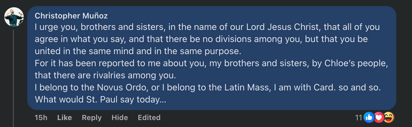 I think—and I’d love your thoughts below—it’s because it subtly treats a legitimate evaluative judgment as though it were factionalism. Saying that the Latin Mass more clearly expresses the sacrificial symbolism of the Eucharist is not the same thing as “belonging to a camp” in the way St. Paul condemns.